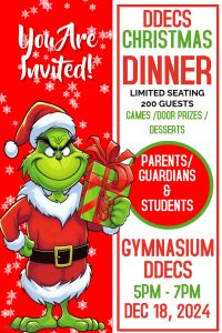We are excited to announce the Parents/Guardians/Students Christmas Dinner. The Dinner will be located in the DDECS Gymnasium. Come and join us!!